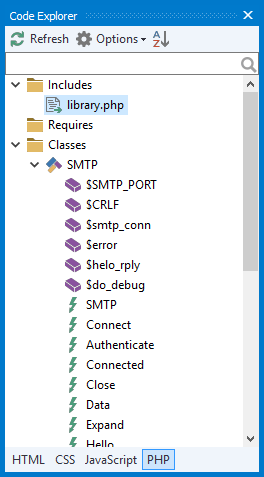 Code Explorer lists classes, functions, variables and includes contained in the script and allows you to quickly move to any of them. You can navigate to an item by clicking it.