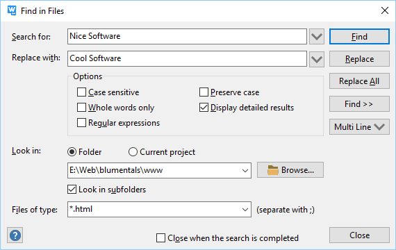 Advanced search and replace features include: