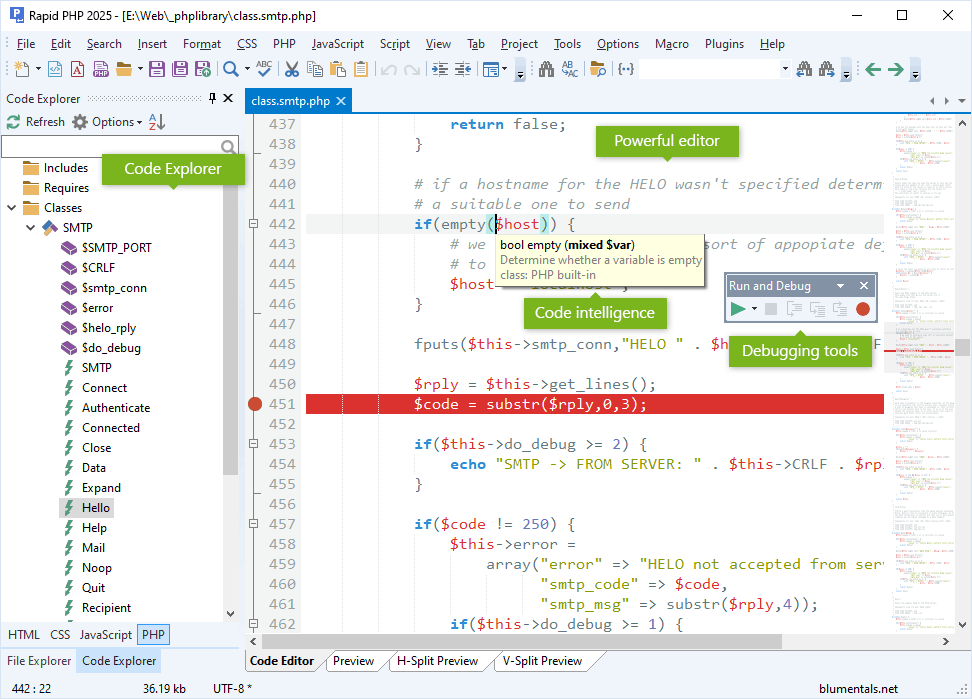 Rapid PHP is also a fully featured CSS editor with all essential functions, such as CSS Auto Complete, Inspector and integrated documentation.