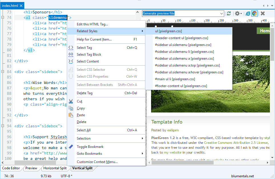 CSS formatting features help you modify style sheets or HTML inline style code very quickly with a single click or shortcut-key press.